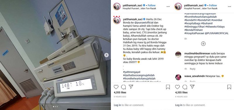 "Haritu 26 Dec Bonda ke @pusrawiofficial dan hampir2 kena admit sbb Doktor bg date sampai 26 shj. Tapi bila check up baby, urine test, CTG (monitor jantung baby), Alhamdulillah semua ok. Air ketuban pun banyak. So doctor Habibah bg masa lg pd Bonda hingga 31 Dec 2019. Tu kira habis nego dah tu..
