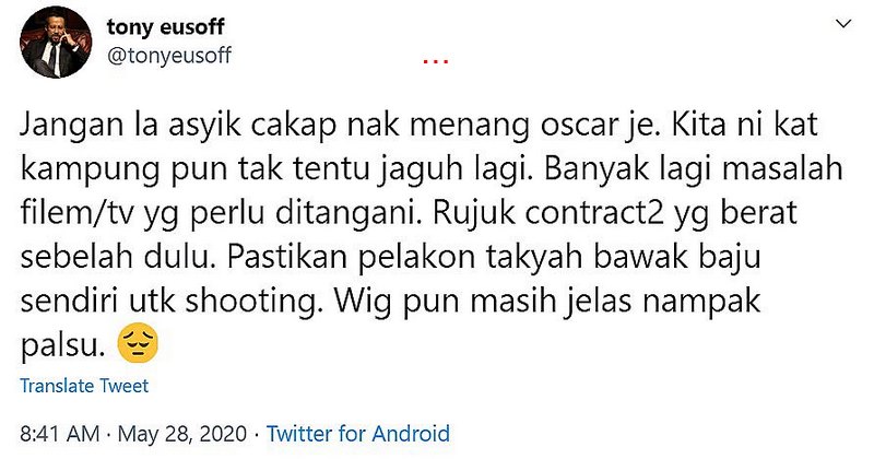Tony dihubungi berkata dia menulis ciapan di platform media sosial itu tanpa niat untuk menghentam mana-mana pihak, sebaliknya bagi membuka mata seluruh penggiat industri seni untuk melihat pelbagai isu dalaman yang perlu diperbaiki, sebelum bercita-cita nak pergi lebih jauh.