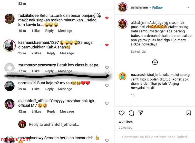 Kesal dengan komen ditinggalkan itu, Aishah mencabar individu berkenaan untuk bersemuka dengannya. Ujarnya, jika berani cakap berdepan dengannya jika ada perkara yang tidak puas hati.
