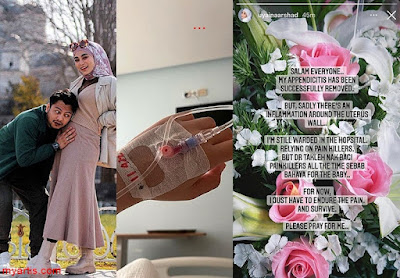 "Assalamualaikum semua. Appendix saya telah pun berjaya dikeluarkan. Tetapi malangnya terdapat keradangan disekitar dinding rahim. Saya masih lagi dirawat di hospital dan bergantung kepada ubat tahan sakit," tulis pengacara dan pelakon Uyaina Arsyad menerusi perkongsian terkini di ruangan Instagram stories.